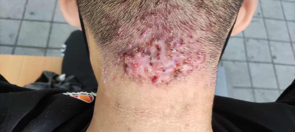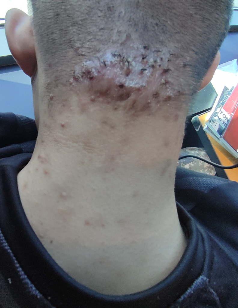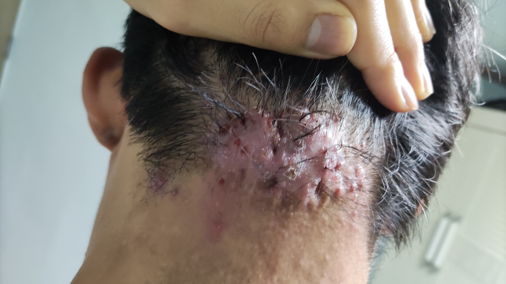 켈로이드 병변이 의심됩니다. 수술적 치료는 또다른 흉터를 만들어내므로 보통은 주사로 치료하게 되는데, 질문자님의 경우에도 범위가 광범위해서 절제보다는 주사치료를 먼저 시도하지 않을까 싶습니다. 피부과나 성형외과를 방문해보시기를 권해드립니다.