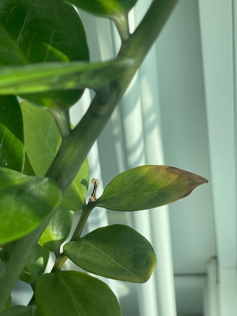 집에서 기르는 금전수의 잎 끝 부분이 아래 사진과 같이 갈변현상이 있습니다.