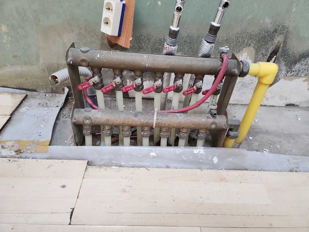 보일러 분배기 상태를 보니 밸브가 왼쪽으로 돌아가 있다면 모두 잠겨 있는 상태 같습니다. 물이 순환이 되지 않기 때문에 쿵쿵 소리가 날 수 있습니다. 밸브를 일자로 돌리세요
