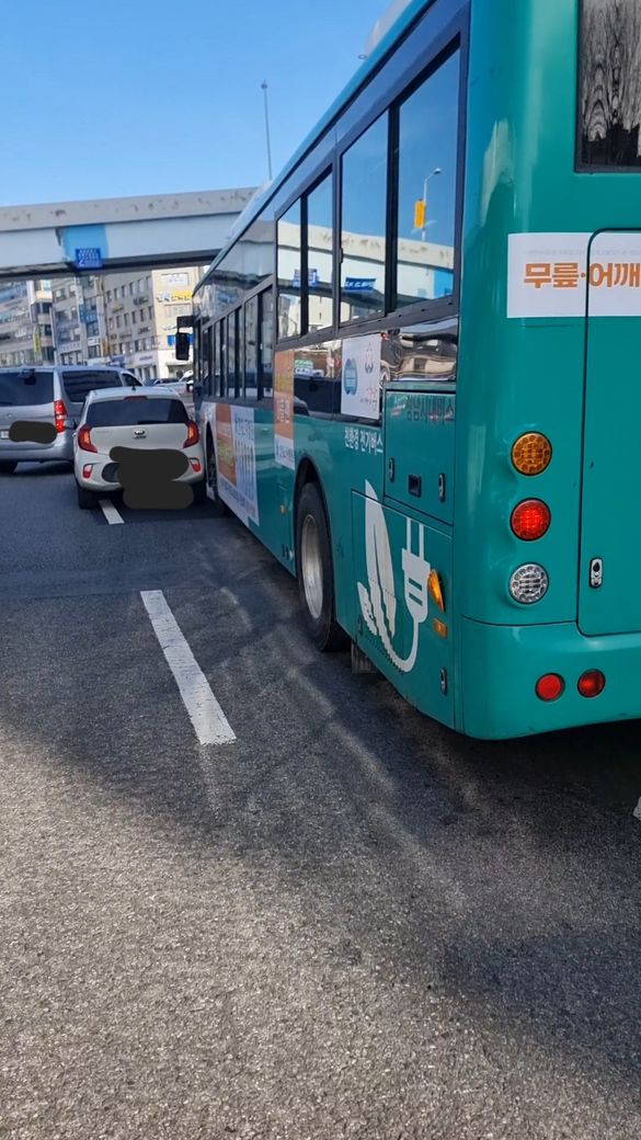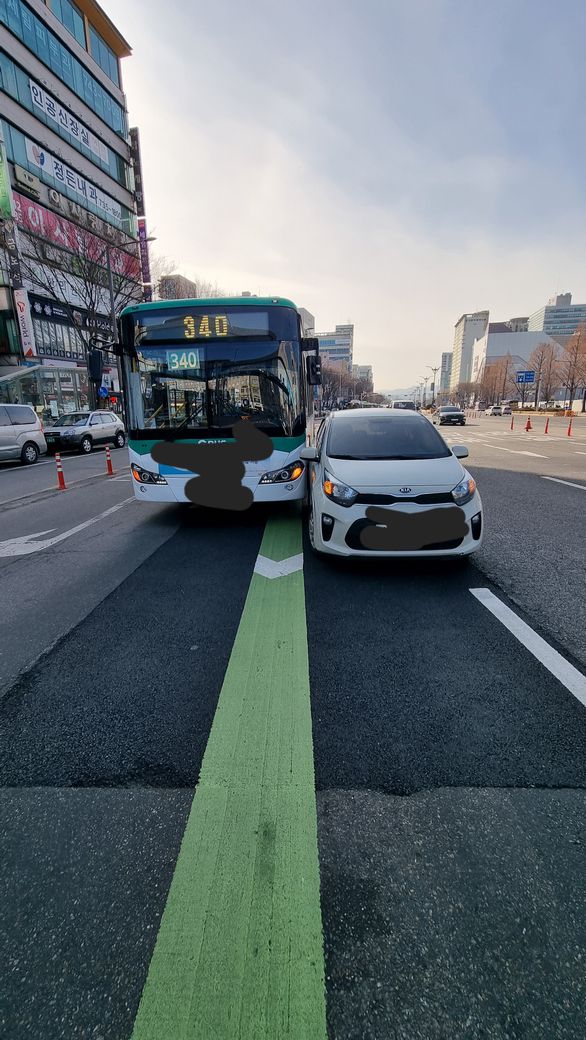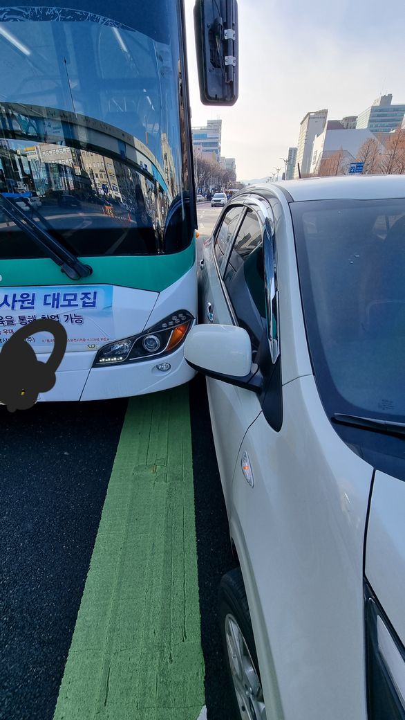 저는 오른편에 있는 버스 확인후 3초이상 오른쪽 깜빡이를 넣고 서서히 차선을 바꿨고 버스는 제 뒷단에서 가속을하며 좌회전을 진행하는 상황에서 사고가 났는데요. 경미해서 양쪽차량 다 스크래치만 난 상황이고 승객분들도 무사히 내리시고 넘어지시는 분 없이 끝났습니다.