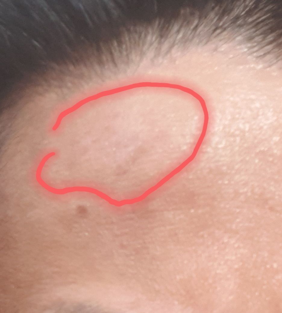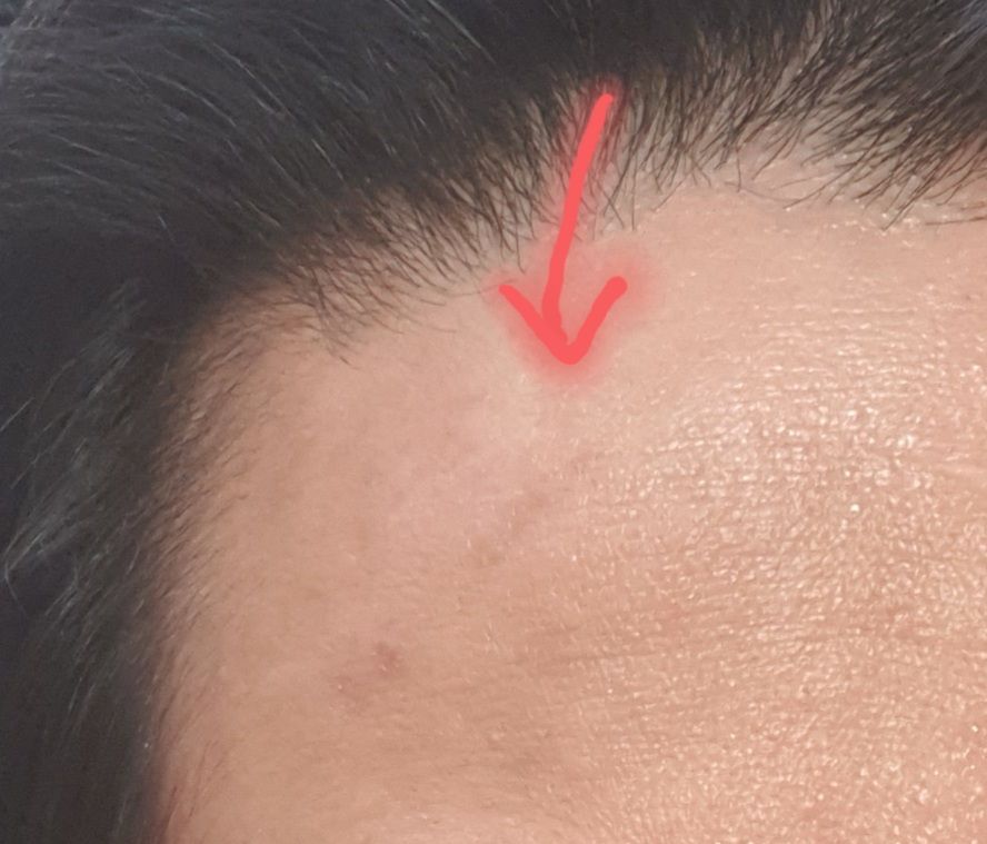좌측 이마 한쪽에 약간의 라인을 형성하며 변색이 일어났습니다.