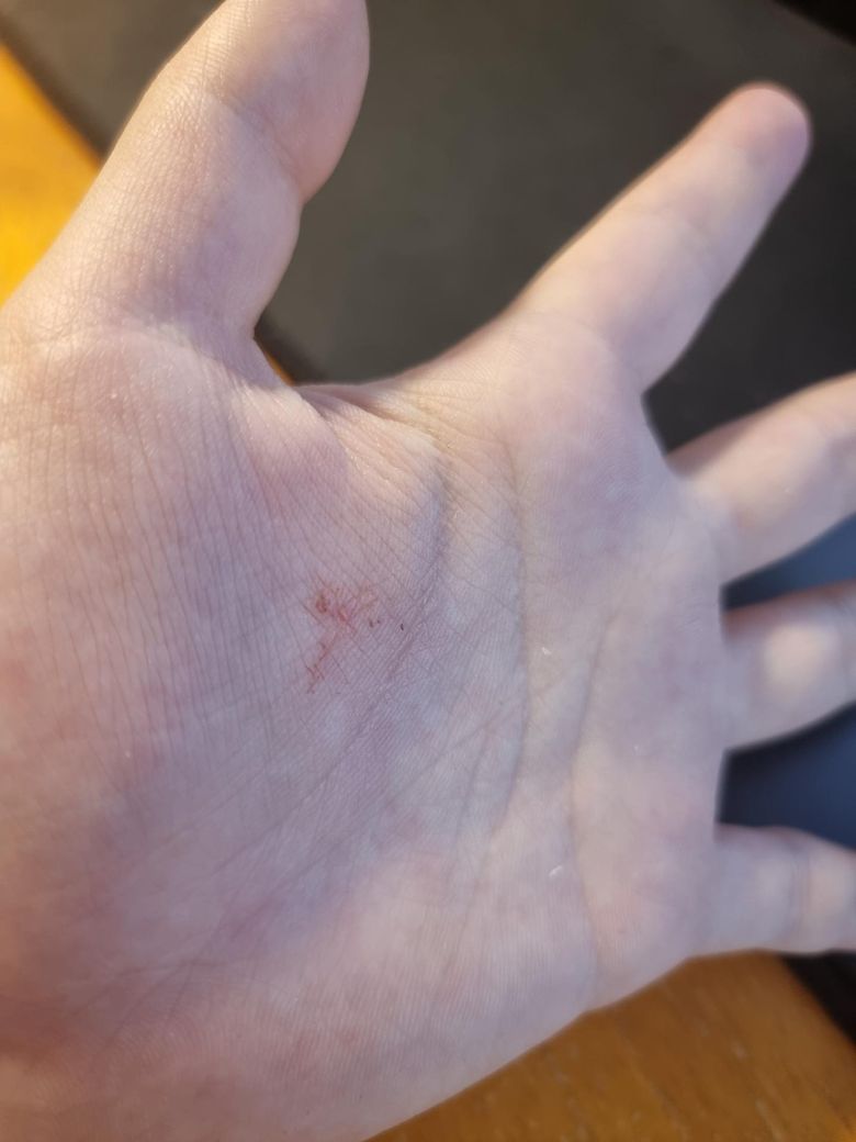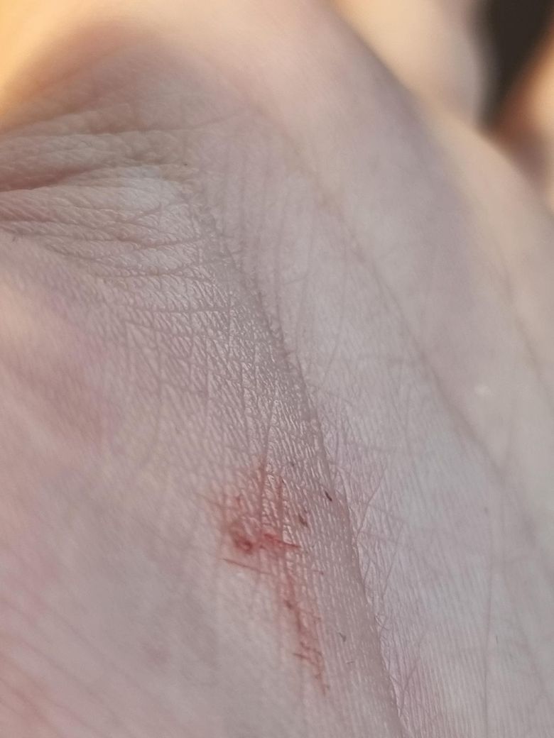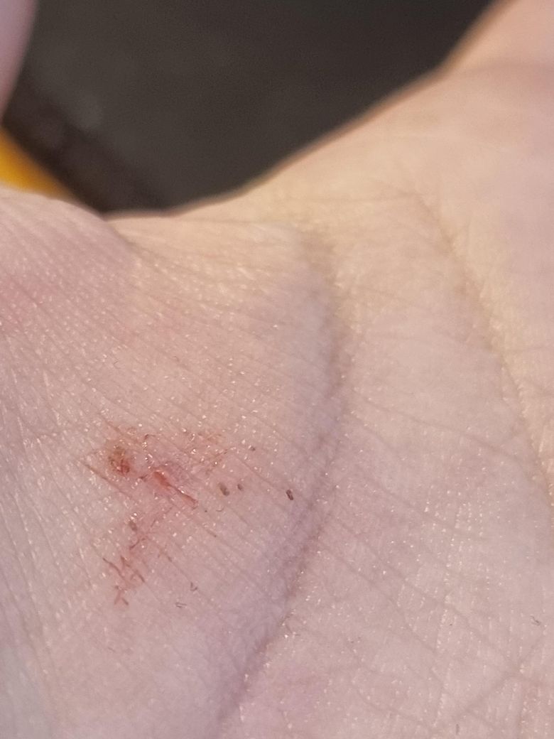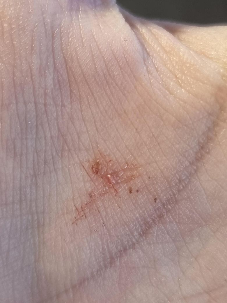 사진 소견만 보면 전형적인 “가시가 박힌 모습”과는 다소 다릅니다. 가시는 보통 하나의 뚜렷한 침입 경로와 중심 이물질이 보이는데, 현재는 작은 점상 병변이 여러 개 있고 표면이 벗겨진 형태라서 단순 이물보다는 경미한 외상이나 마찰 후 생긴 표피 손상, 또는 아주 작은 이물질이 이미 빠지고 남은 흔적 가능성이 더 높습니다.