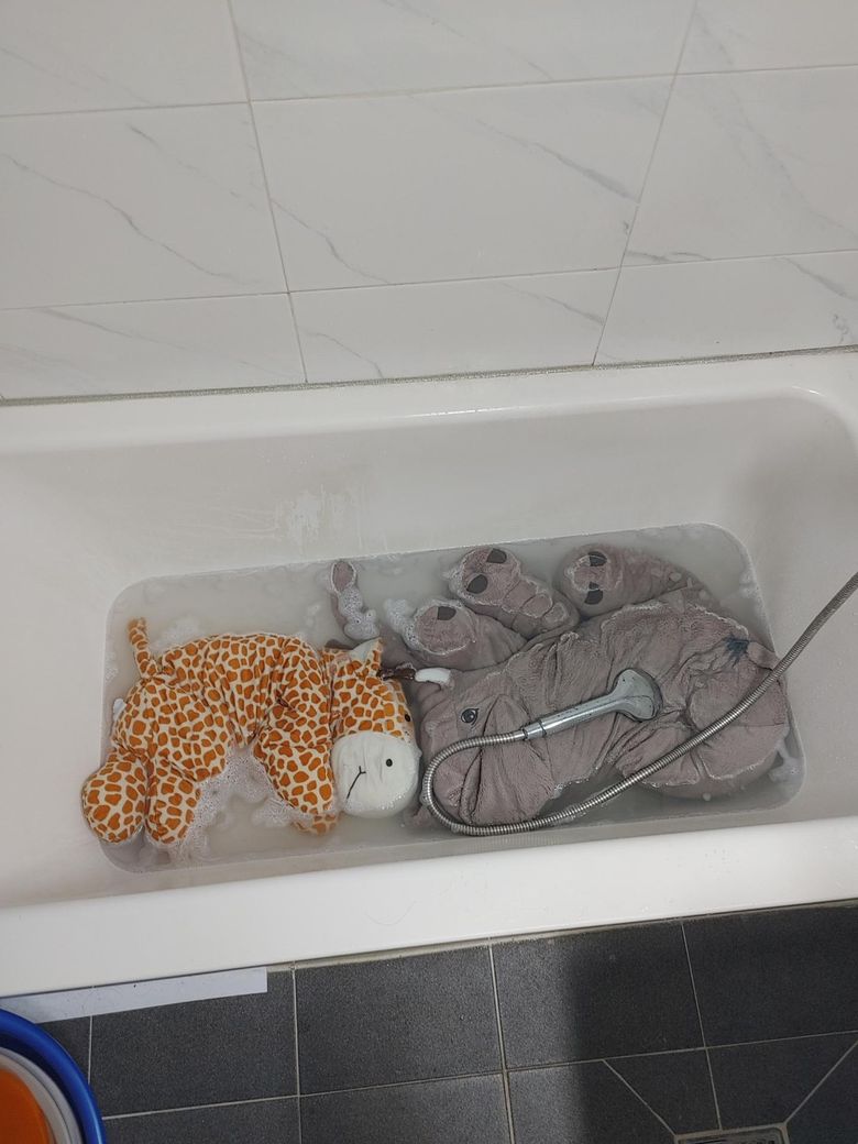 인형들 다 잠기게 물에 담궈주고 세제 1컵 넣고 밟아서 빨면 될거같네요.