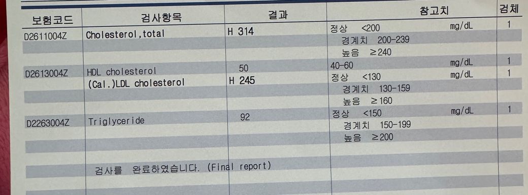 최근 5kg 감량 후 재검했으나 콜레스테롤 토탈 314