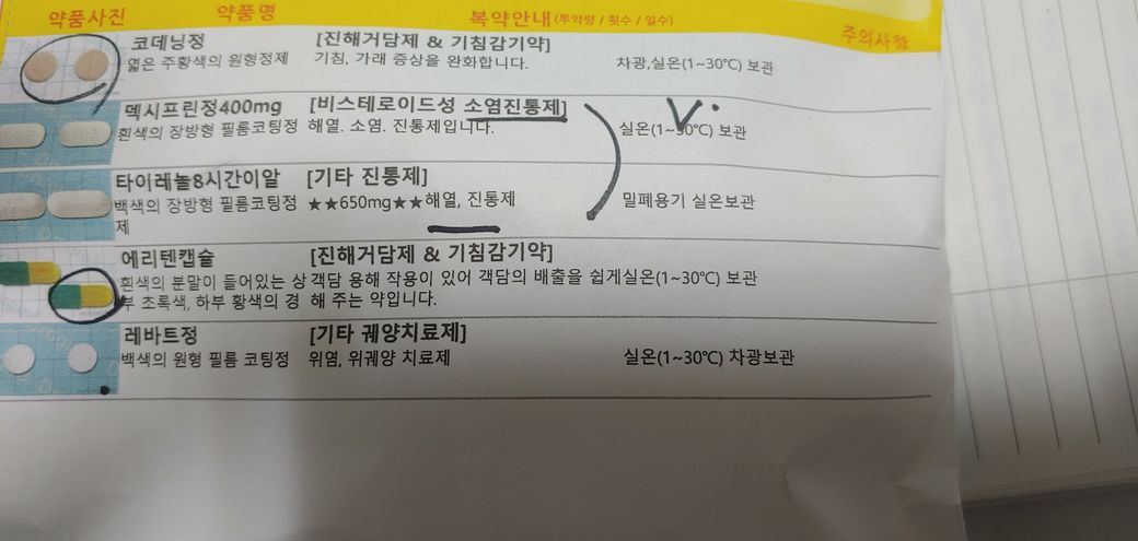 - 처방에 타이레놀과 이부프로펜 계열 약이 다 들어있으니 처방약 포함해서 하루 9정 미만으로 이부프로펜으로 드세요