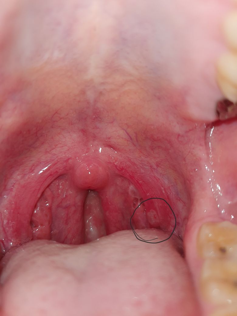 목사진을 찍어 봤는데 동그라미 친 부분에 구내염처럼 하얀색으로 동그랗게 염증이 나 있는데 통증의 원인이 저게 맞을까요? 맞다면