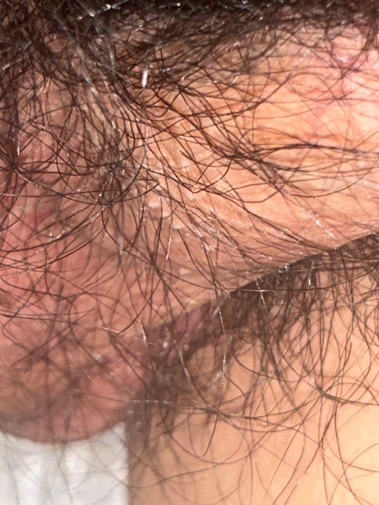 사진 첨부하였습니다. 이런식으로 하얀 돌기가 털 쪽에 주로 많이 나 있는데 성병인가요? 만져보면 조금 오돌토돌한 느낌이 나는것 같습니다
