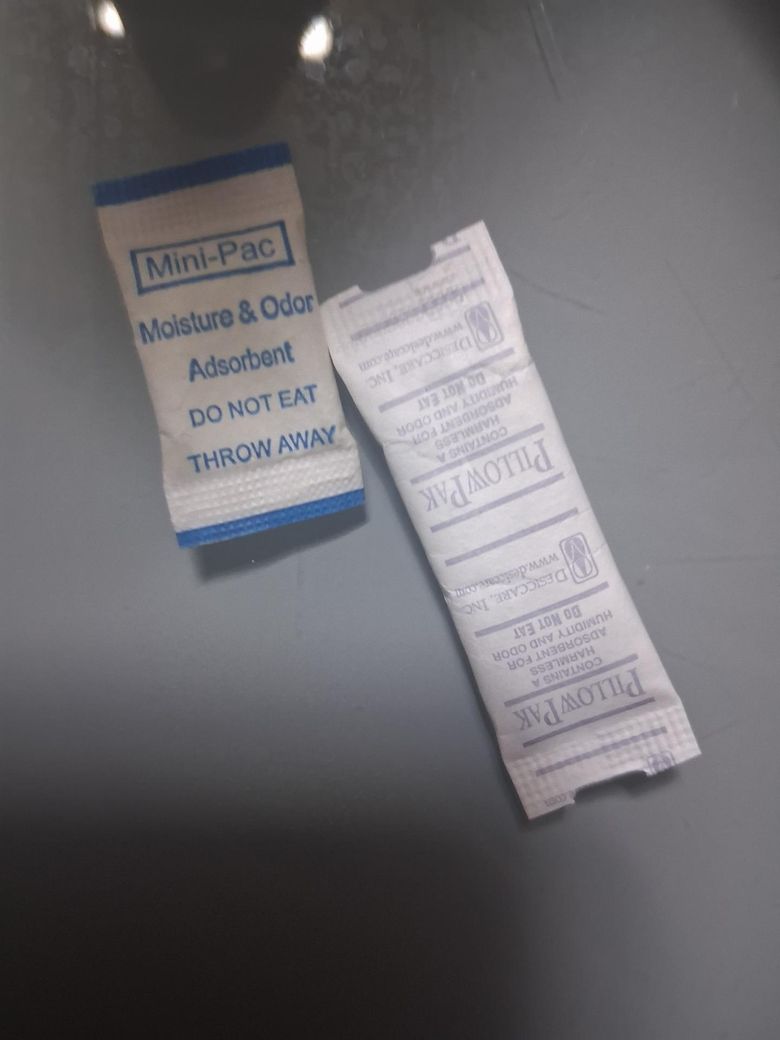 사진에 보이는 것은 일반적인 소형 습기제거제입니다. 왼쪽은 실리카겔, 오른쪽은 활성탄 또는 실리카겔 계열로 보입니다. 두 제품 모두 포장지에 적힌 것처럼 식용은 아니지만, 독성은 종류에 따라 차이가 큽니다.