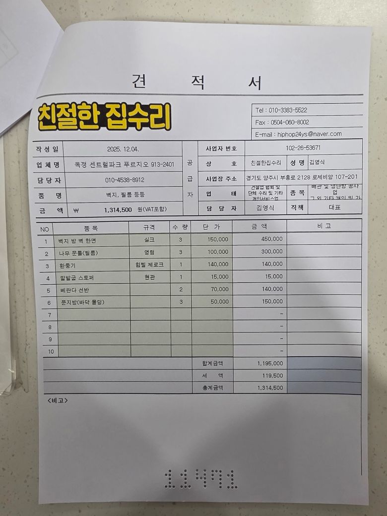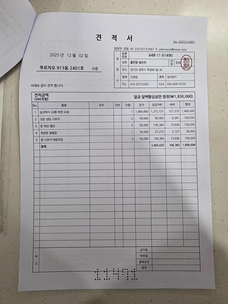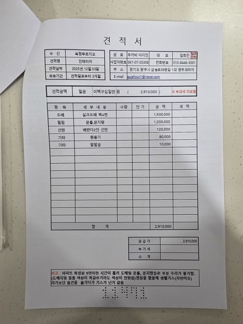 앞뒤사정 모르는 인테리어 업자한테 200만원의 견적서을 받아서 내세우고 있습니다..