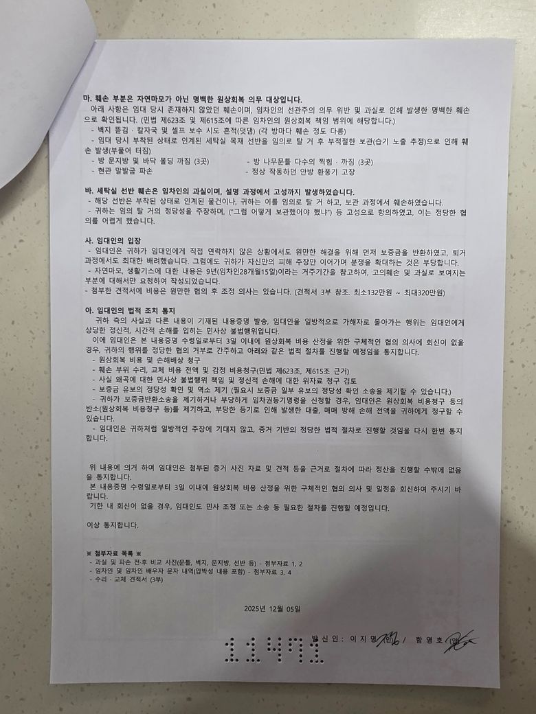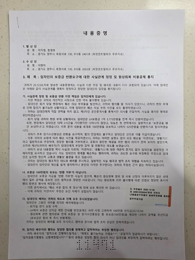임대인이 보낸 내용증명도 한번 보시고 판단해주세요