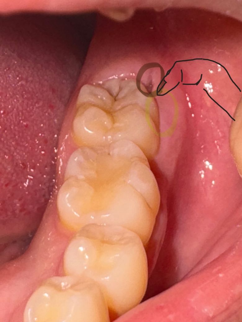 오늘 밥먹고 저 부분에 무언가 낀듯한 불편감을 느끼고 봤더니 저런 구멍(갈색동그라미)이 나있었고