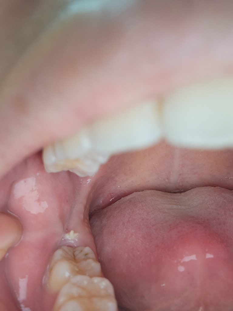 위의 사랑니가 아래로 내려와서 아래 잇몸을 누르게 된다면 해당 사진과 같이 하얀색으로 보이는 형태를 띨 수 있습니다. 이런 경우에는 내려온 사랑니를 발치하거나 잇몸을 자극하는 부위를 다듬어 줘야 할 수 있습니다. 자세한 확인을 위해서 치과에서 진료를 받아보세요