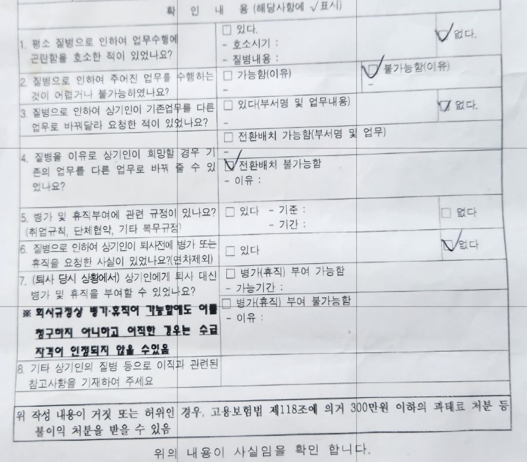 실업급여 질병 등 으로 인한 퇴사획인서(사업주)