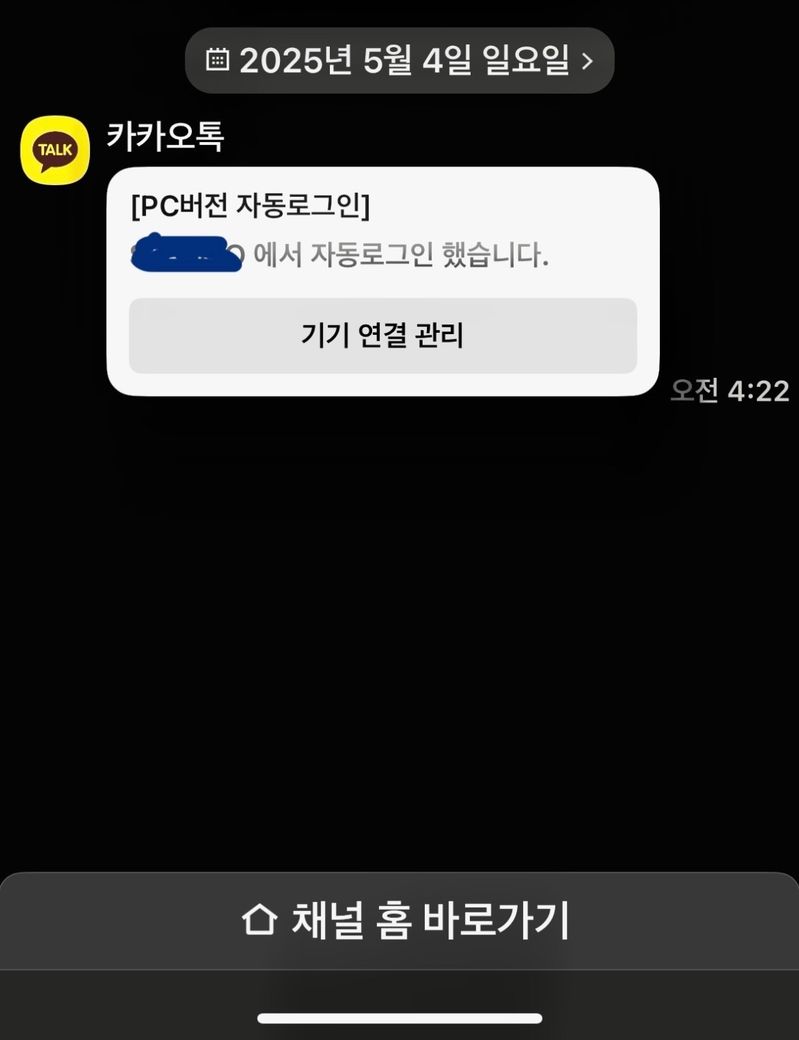 아침에 일어나 보니 새벽 네 시쯤 PC 버전 자동 로그인 알림 카톡이 와 있었어요. 알림에 있는 해당 PC 이름(제가 가린 부분)은 제 방에 있는 노트북 이름이에요 노트북은 자기 전 제가 절전 모드로 전환 후 모니터를 덮고 잤는데 어떻게 로그인이 가능한 걸까요?