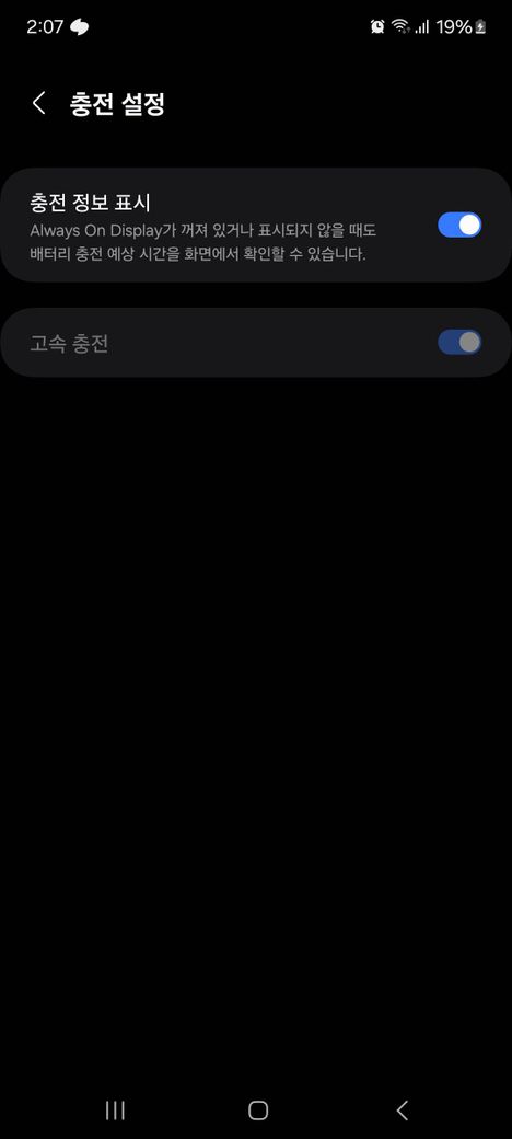 배터리 설정에 들어가서 고속충전을 확인해봐도 온오프 조절도 못하게 되어있네요 원래 이런가요?
