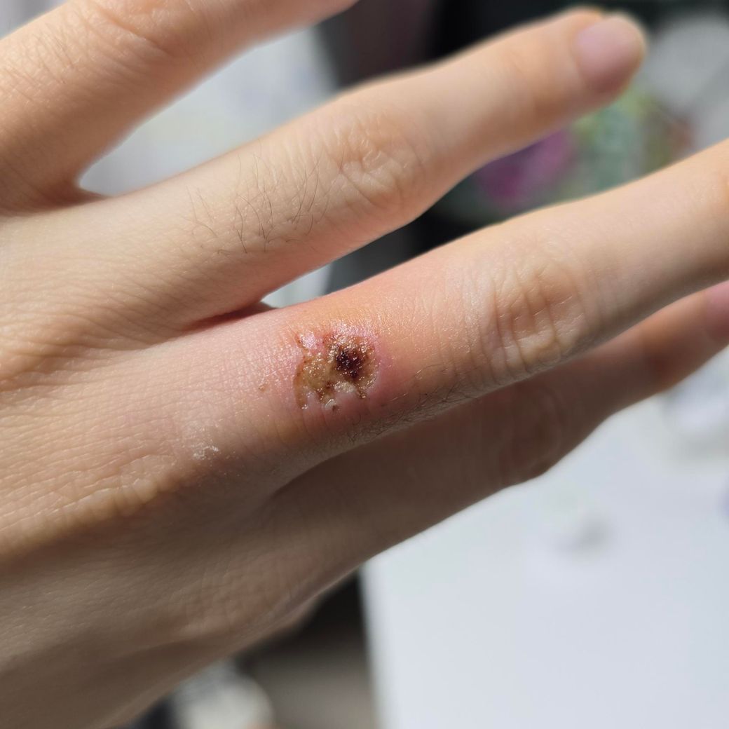 현재 사진처럼 진물과 가피가 섞여 있는 경우에는 국소 감염 가능성을 배제할 수 없으므로, 발적이 주변으로 퍼지거나 부종, 열감, 통증 증가, 고름이 생기면 즉시 내과 또는 외과 진료를 권합니다. 필요 시 경구 항생제 처방이 고려됩니다. 또한 파상풍 예방접종이 최근 10년 이내인지 확인이 필요합니다.