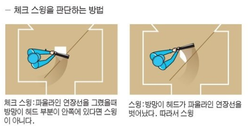 보통 애매한 스윙을 체크스윙이라고 합니다. 이 체크스윙 기준이 참 애매한 상황이지만 그래도 타자의 방망이 헤드를 기준으로 스윙 여부를 이야기합니다.