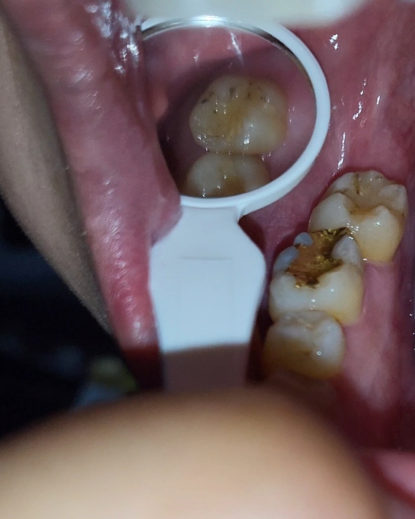 인레이 주변으로 착색된 물질들이 보입니다.