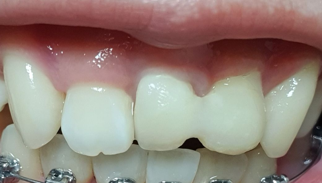 사진 보시면 앞니 뽑은 자리에 뽑은 이빨을 임시로 브릿지처럼 달아서 그 이빨을 갈면서 공간을 좁히고 있거든요