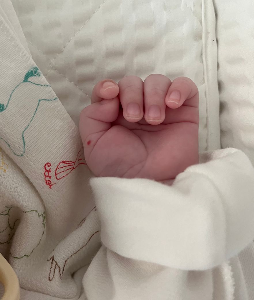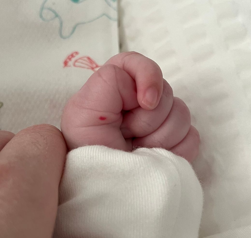 90일 아기 손에 빨간 점이 있어요.