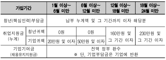 청년공제 가입 후 실시기업 귀책사유(휴・폐업, 도산, 기업 사유로 인한 휴직, 임금 체불, 고용보험료 체납, 기업의 지원금 신청 지연, 직장 내 괴롭힘, 직장 내 성희롱, 부당해고, 권고사직, 대기업 변경)로 중도해지된 청년에게 지급되는 해지환급금은 아래 표와 같이 청년부담금과 가입기간까지의 취업지원금 환급금의 합계액 및 각각의 이자로 합니다.