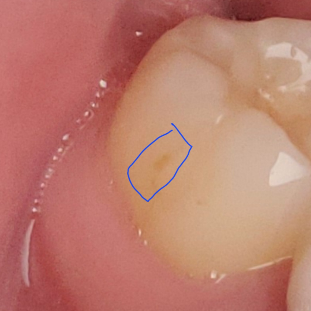 사진만으로는 정확한 답변을 드리기는 어렵습니다. 다만 현재 사진으로 유추해보았을 때는 단순 착색 및 변색일 가능성이 큽니다. 일반적인 충치 양상과는 차이가 있어 보입니다. 물론 정확한 것은 치과 방문 후 검사를 해보셔야 합니다.