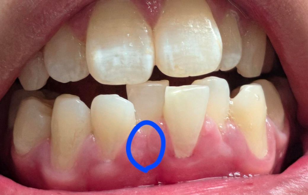 양쪽 잇몸 경계 부위가 겹쳐서 세로선이 생긴 것으로 보입니다. 현재 치열이 가지런하지 않으므로 잇몸끼리 서로 가까워서 생기는 일종의 주름이라고 생각이 됩니다. 현재 보여주신 사진만으로는 정확한 판단이 어렵지만 잇몸 색과 모양으로 보아서는 정상일 가능성이 높습니다. 물론 치과를 방문하여 정확한 검사를 진행해보시길 바랍니다.