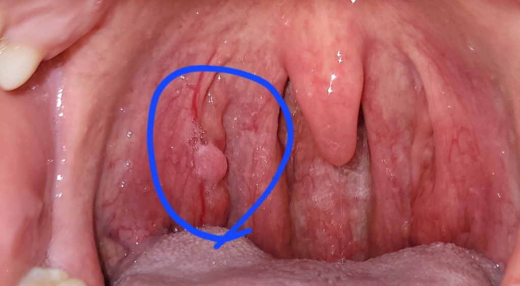 편도 부근에 혹으로 추정되는 덩이가 보이고 있으니 이비인후과를 방문해 확인해보시는 것이 좋겠습니다.