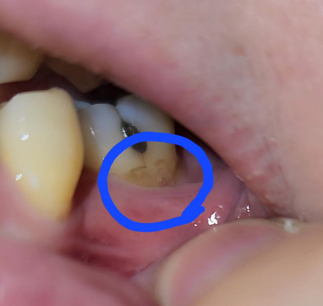 동그라미 핀 부분에 침이 고여있어 잘 보이지는 않지만, 확실이 주변에 비해 색이 좋지 않은게 부식이나 충치가 있어보입니다. 그런데 이 치아가 아말감이라는 재료로 떼워져있고, 금간 선도 검게 보이네요..아마 씹는면도 떼워져있을 듯 한데 맞나요?어쨌든 동그라미친 부분만 제거하고 떼울 수 있을지는 치과가서 자세히 보셔야하겠지만 아마 신경치료하고 씌우게 될 가능성도 있어보입니다. 금간치아는 기존재료를 떼어내고 새로 떼웠을 때 오히려 더 시리거나 아픈 증상이 있을 가능성이 아주 높거든요.