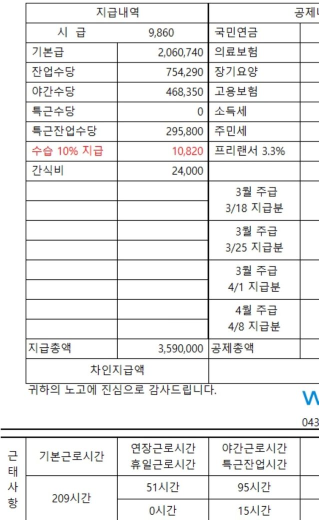 월급 명세서에 209 시간 × 9860 원만 기재되어있고