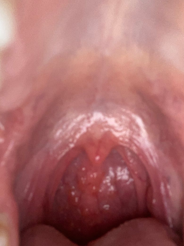 현재 인두 부위 발적 소견은 보이는 것 같지만 사지만으로는 정확히 감별이 어렵습니다. 염증으로 늘어난 것 처럼 보이는 부위는 목젖을 의미하는 것 같습니다. 해당 부위 염증이 있다면 목을 많이 사용하는 연설이나 노래를 부를 시에 영향이 있으며 현재 증상은 상기도 감염 혹은 코로나19로 인한 증상일 수도 있으니 내원하시어 진료를 받아보시는 것이 좋겠습니다.