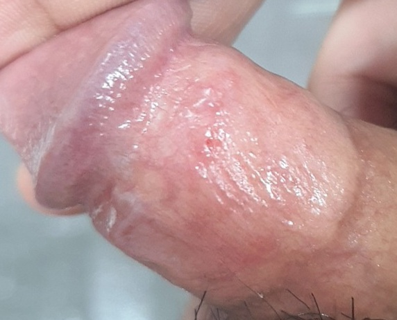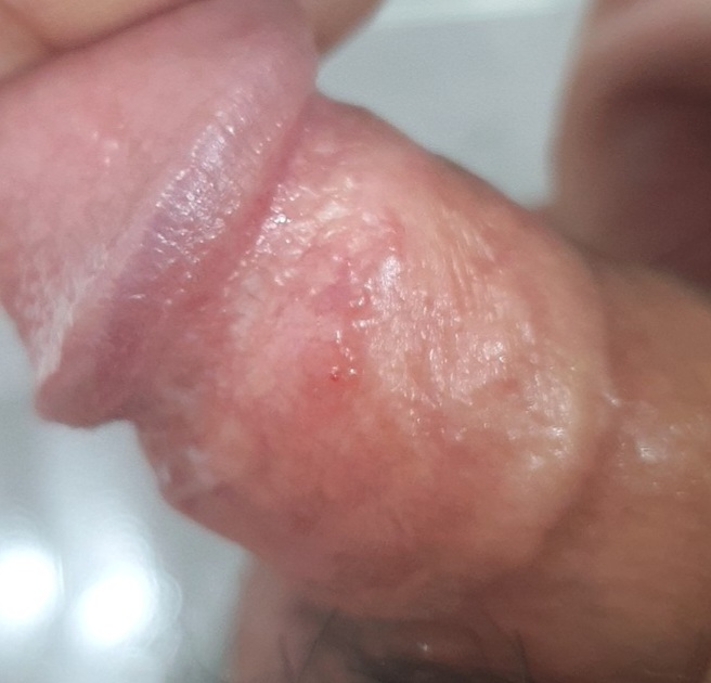 그런데 "오늘" 자위시에 귀두~포피주위에 마른 각질 부스러기가 일어나서 떨어지는 현상이 있었고, 그 이후 샤워중에 뭔가 조금 따끔거려 보았더니 사진처럼 바늘구멍만하게 상처가 있었습니다. (곤지름 치료부위와 무관함)