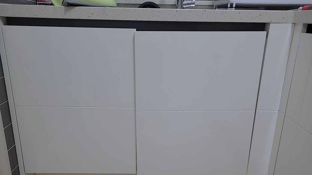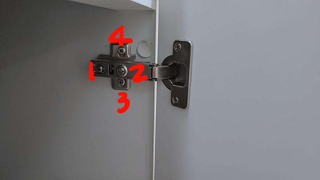 싱크대 오른쪽 문이 안맞아요. 경첩조정을 어뜨케 해야하나요? 사진 첨부합니다~~경첩 1-4를 어뜨케 조정하는지 자세히 답변바랍니다~