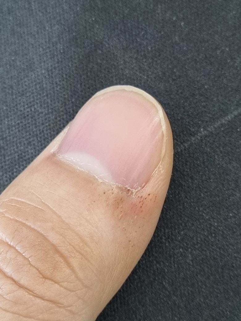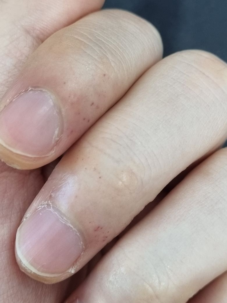 안녕하세요. 현재 왼쪽 엄지 검지 중지 끝부분에 붉은색 좁쌀 반점이 생겨 질문드립니다. 기존에도 엄지손가락에는 있었는데 최근 며칠 사이 검지와 중지에도 발생했네요. 오른손잡이 이며 특별히 외상을 입었을 가능성도 없는데 무슨 증상인가요?