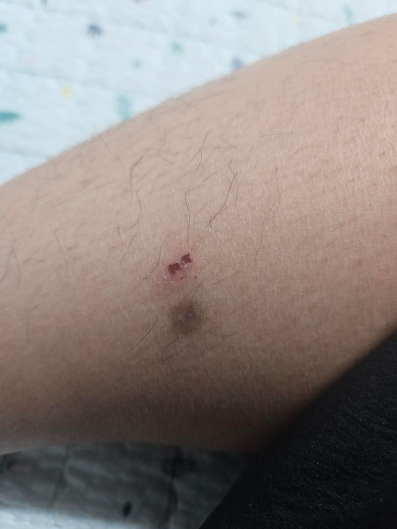 방금 전까지 없었는데 종아리 부위에 피묻은 이빨 자국하고 고름 짜고 남은 느낌의 반점이 생겨가지구여.. 반점쪽 피부는 거의 피지 짜고 난 후인것 마냥 흐물거리고 상처쪽은 건드니 경련같은게 일어나는데 이거 벌레 물린 자국 맞나요?
