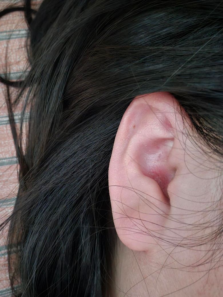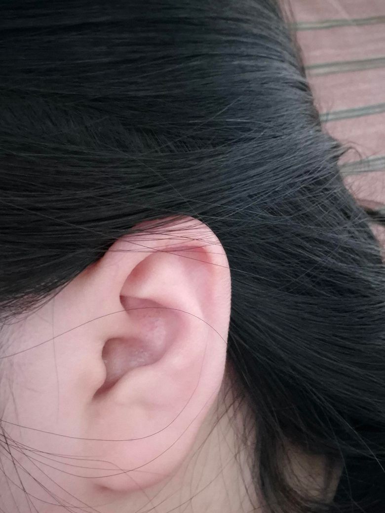 왼쪽 귀 좀 봐주세요 빨개진 부분을 만지면 아파요