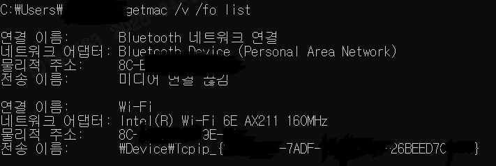 # MAC 주소를 가져오는 명령어 실행