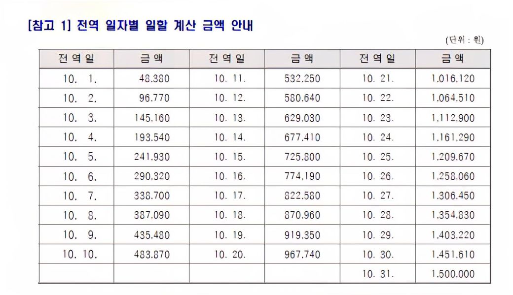 전역 예정자의 경우 월급은 실제 복무한 일수 기준으로 일할 계산되어 지급됩니다. 질문자님은 10월 1일부터 21일까지 근무 후 전역 예정이시라, 전체 월급이 아닌 21일치만 계산되어 지급되는 것이 맞습니다. 사진에 나온 100만 원은 한 달 전체 근무 기준 금액이고, 정기급여 안내에 나온 82만 원은 공제 후 실제 입금액이라 차이가 나는 것입니다. 전역일이 속한 달은 이렇게 부분 지급이 이뤄지는 게 정상이에요.