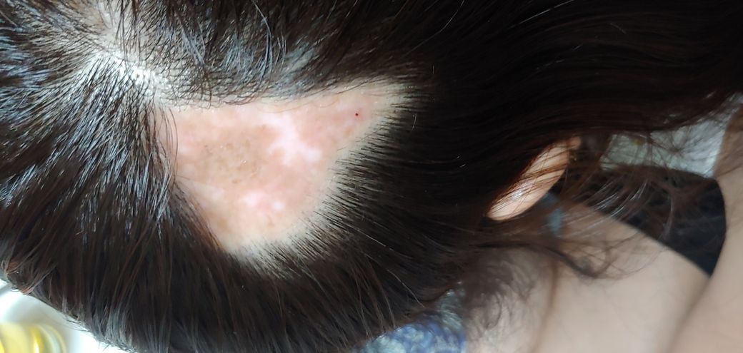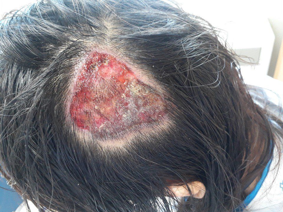 2년전 전신마취하여 둔부 피부이식수술을 진행하는 중에 둔부에 피부이식수술을 마치니 채집한 피부조직이 많이 남아 아까워서 간단히 드레싱으로만 치료를 하고있던 머리부분에다가 피부이식수술을 하였답니다.