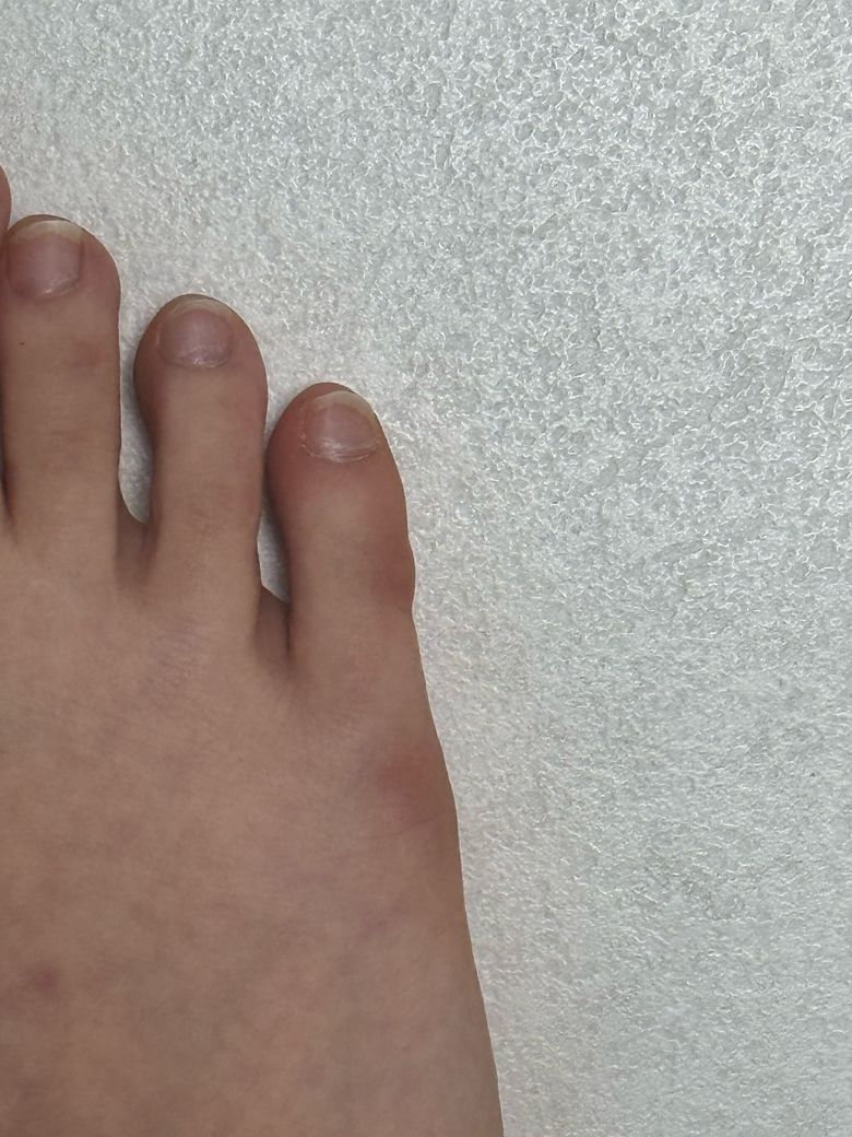 사진을 보면 오른쪽 새끼발가락이 전체적으로 약간 부어 있고, 네 번째 발가락 쪽으로 눌려 있는 양상이 관찰됩니다. 외관상 피부색 변화나 개방성 상처는 보이지 않습니다.