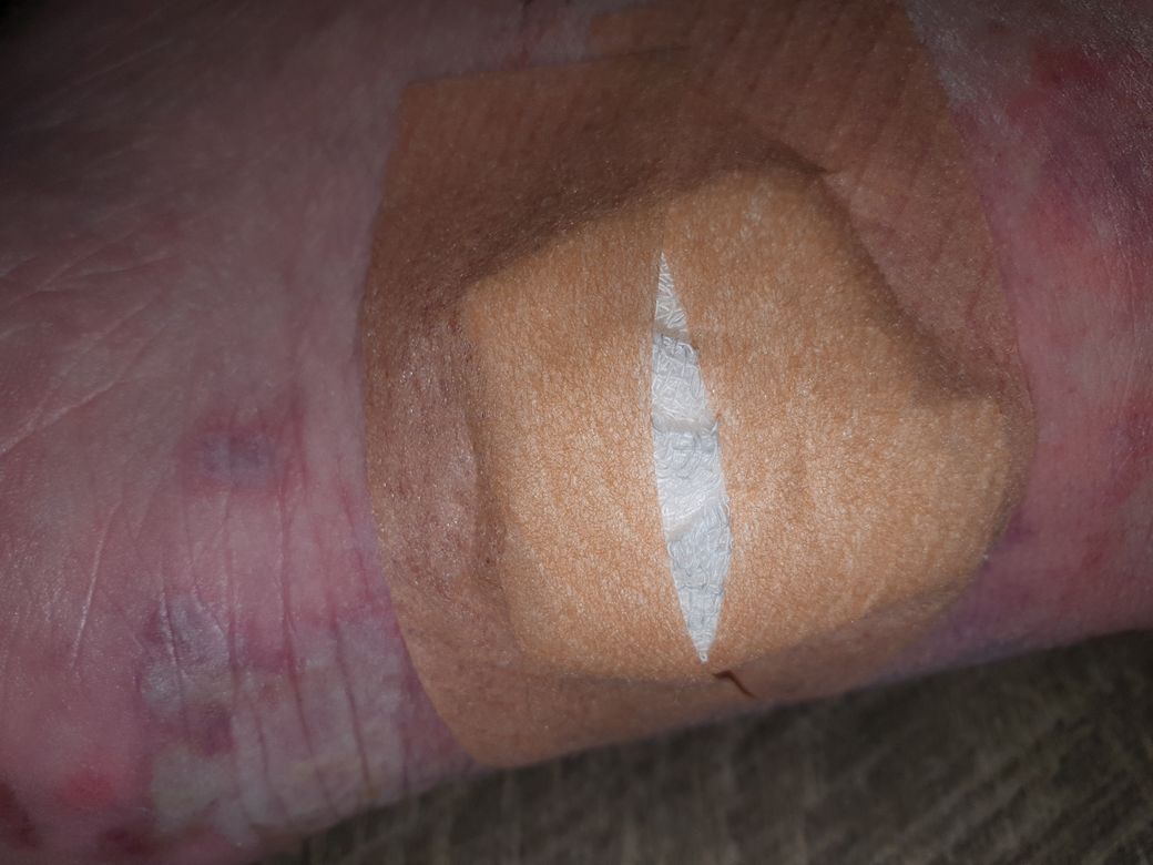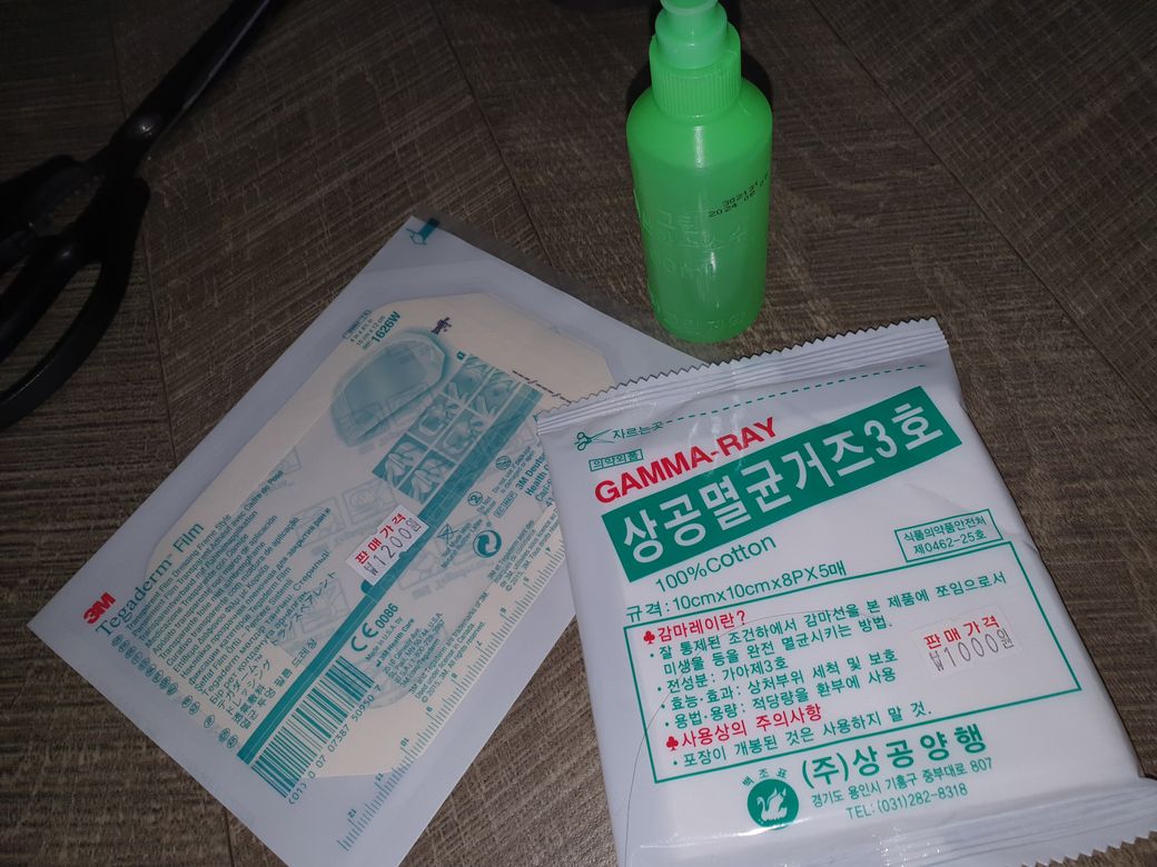 과산화수소수로 소독을 한 뒤 거즈로 거즈를 바르고 그 위를 방수밴드로 바릅니다.