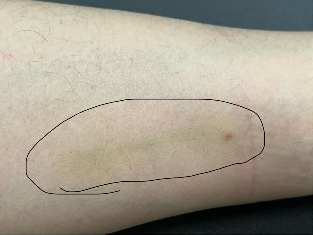 수액을 맞은 부위에 혈관염과 멍이 발생한 상황이라 볼 수 있습니다. 염증은 가라앉았고 멍이 남아있는 상황이지만 시간이 지나면 사라질 것으로 보입니다. 염증만 해결되면 문제가 되는 부분은 아니기 때문에 건들지 않고 두시면 되겠습니다.