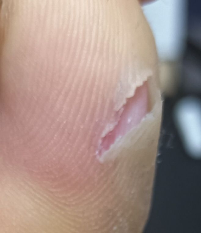 발가락 피부가 짓물러서 연해져 있는 상태에서 과한 마찰이 일어나 손상이 된것 같습니다