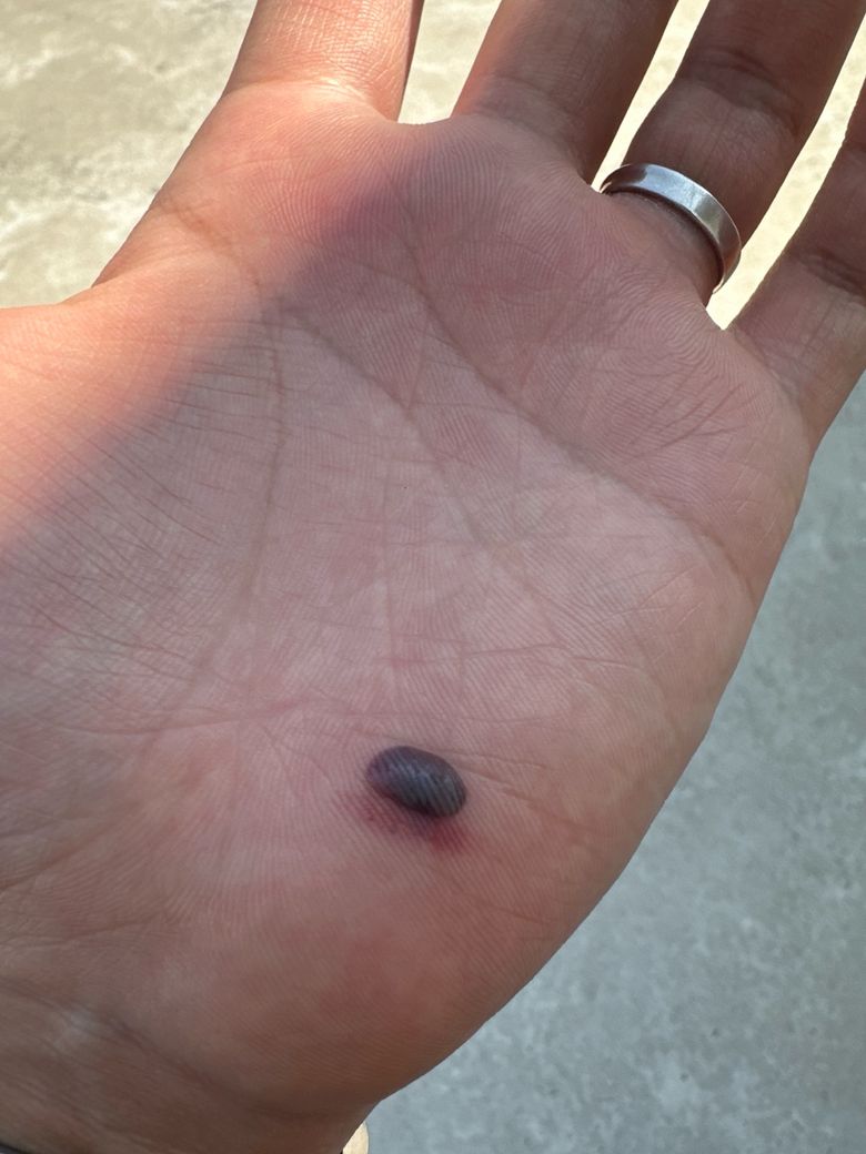 사진 소견상 손바닥 연부조직 내 출혈로 인한 혈종(피고임)으로 보입니다. 둔상 이후 피부 아래에 혈액이 고이면서 검게 보이고 약간 돌출된 형태가 특징입니다.