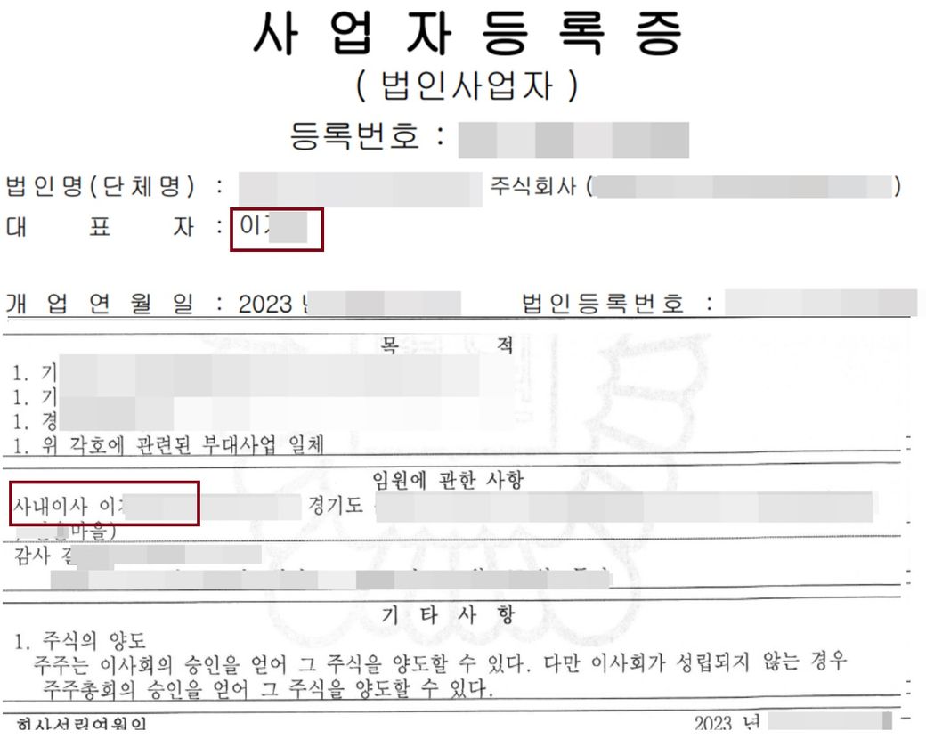 사업자등록증 상 대표이사 =법인등기부등본상에 있는 사내이사