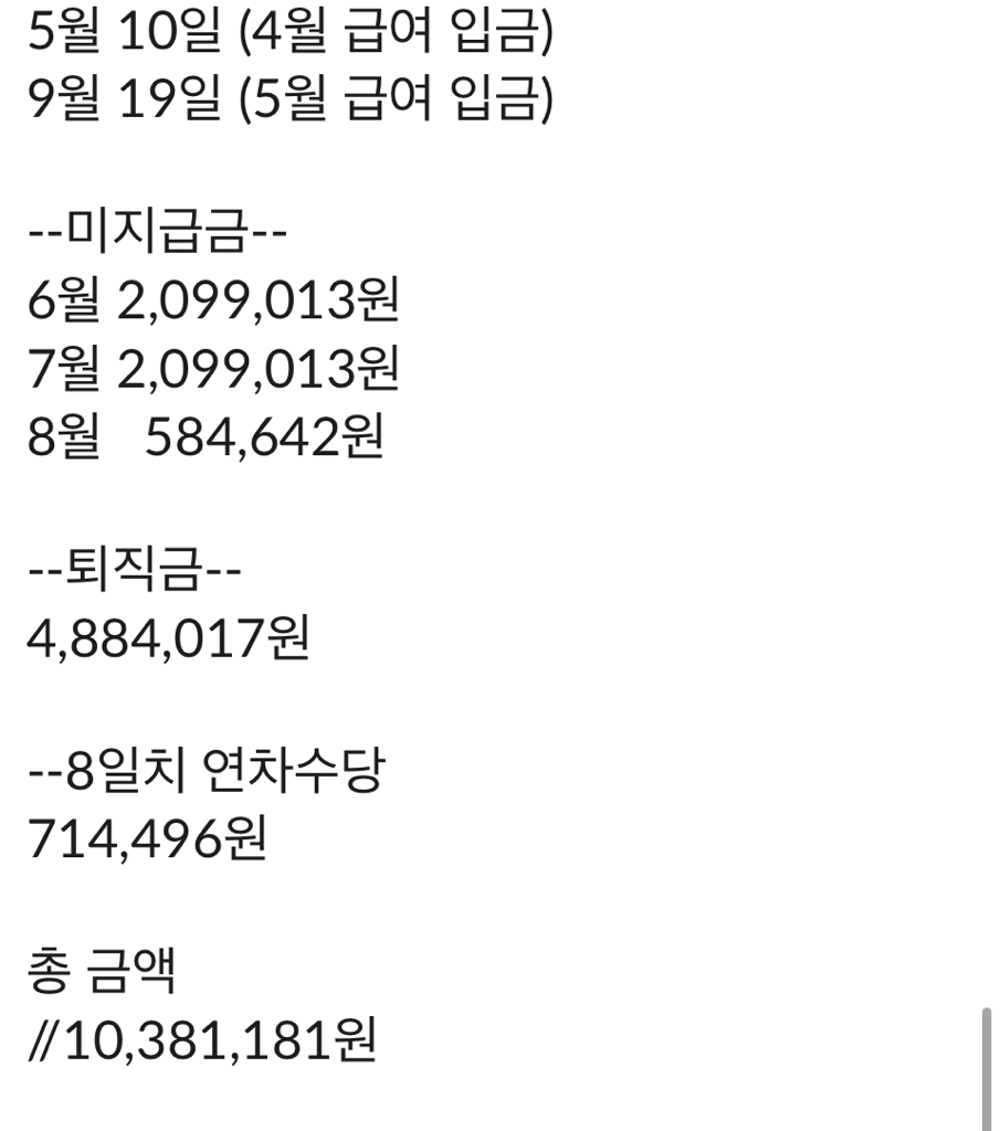 임금체불, 퇴직금, 연차수당 종합 1,038만원입니다.