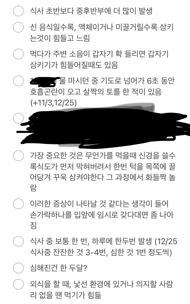 액체류에 훨씬 심각합니다. 물이 기도로 넘어가 호흡곤란이 왔던 경험만 3-4번이어서 물 마시는 것이 극도로 고통스럽습니다. 남들은 아무생각 없이 마시는 물을 저는 고통스럽게 한모금 마십니다. (침 삼키는 것은 문제 없습니다.)