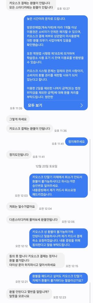 저는 일단 환불이 불가하다는 사실만 재차 확인한 후 우선 끊고 정보를 찾아봤습니다. 정보 상 모호한 부분이 많았지만, 저의 경우 기간권으로 1달 이상의 결제를 하였기에 계속거래에 해당되며 이는 남은 기간에 대해 환불 및 일정의 위약금(10%)을 요구할 수 있다. 라는 내용을 확인했고 이를 근거로 사장님께 문자로 환불을 재차 요구했습니다. 하지만 계속 "키오스크 환불 안됩니다." 라고 키오스크 기기가 환불이 안되서 불가한 것 처럼 말씀하셔서 제가 카드사 요청해서 취소하겠다 동의하냐니까 그건 또 동의 못한다고 하십니다. 위의 내용으로 보아 키오스크 환불 불가는 거짓인 거 같습니다.