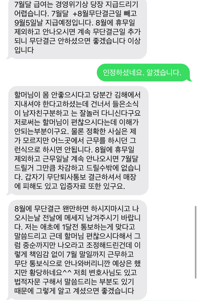 7월 월급을 차감해서 주겠다는 뜻이고, 노동부에 바로 신고하시는 게 좋겠습니다. 변호사 어쩌고 하는 소리는 그냥 무시해도 됩니다. 계속 나오라고 하는 건 거부하면 되고 그런 걸 강제 근로라고 하지 않습니다.