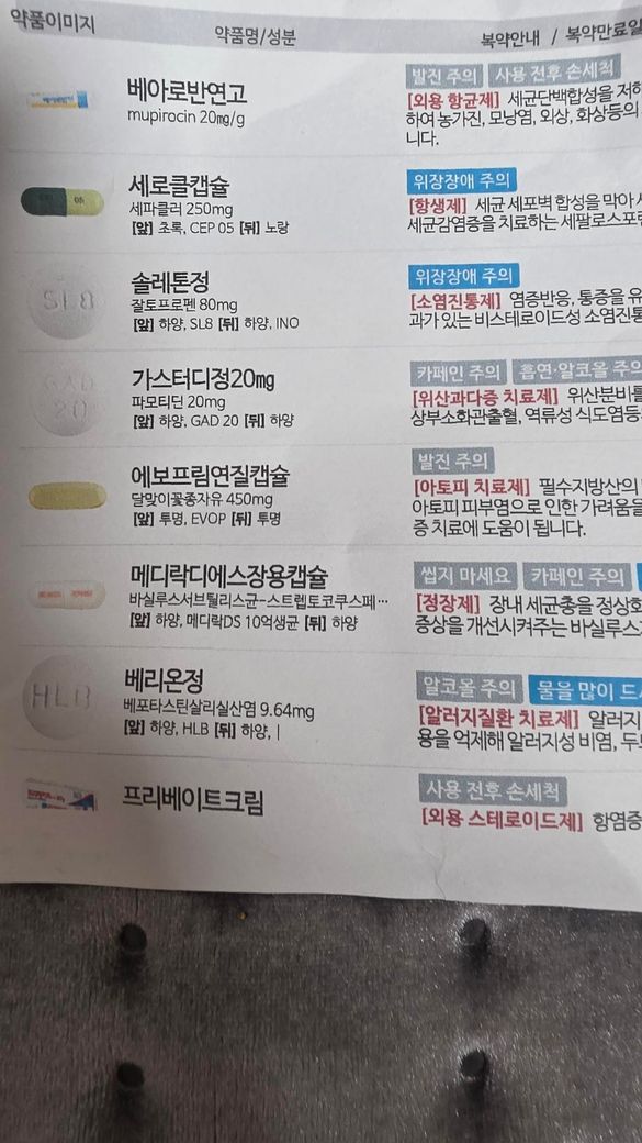 사진 속 아토피 처방 구성은 세파클러(항생제), 솔레톤정(진통소염제), 가스터디정(위장약), 에보프림(달맞이꽃종자유), 메디락(유산균), 베리온(알레르기약), 프리베이트크림/베아로반연고(외용제) 정도인데, 이 약들은 남성형 탈모약과 병용해도 대체로 안전한 조합입니다.